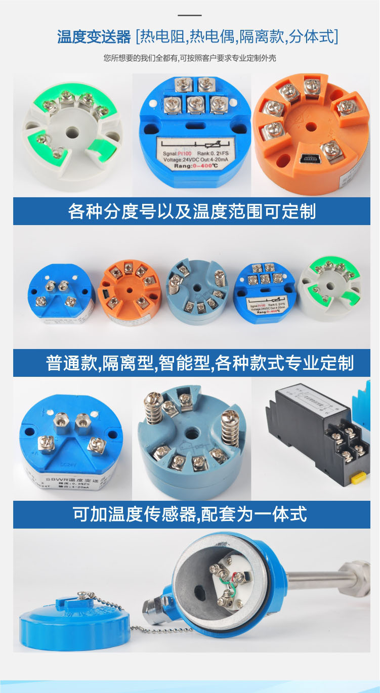 適用范圍廣、既可以與熱電偶、熱電阻形成一體化現(xiàn)場安裝結(jié)構(gòu),也可以作為功能模塊安裝在檢測設(shè)備中和儀表盤上使用;